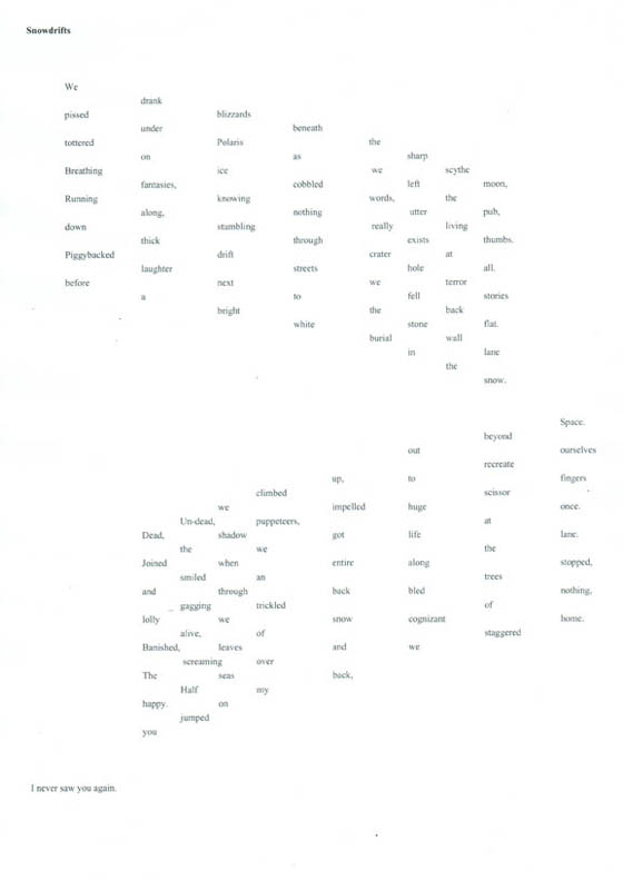 Beautiful. The grand childishness that comes with snowfall is there. You have to give up hope of fixing the vision solely on any one thing; images, lines, words flicker and recede.